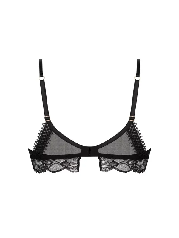 Cup uit leaverskant, uitgewerkt aan decolleté. Midden decolleté verrijkt met een geborduurd pailletten boordje. Basque uit tulle en Leaverskant en verrijkt met een gepailleteerde guipure uitsnijding achteraan. Kleine satijnen strikjes aan aanzet bandjes. Deze bh heeft geen beugels.