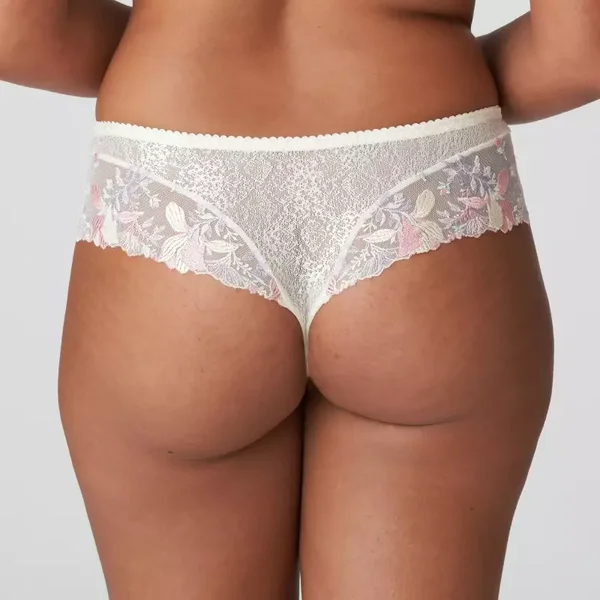 Chic glanzende luxestring met een ingewerkte kantstructuur en brede stroken broderie aan de benen.