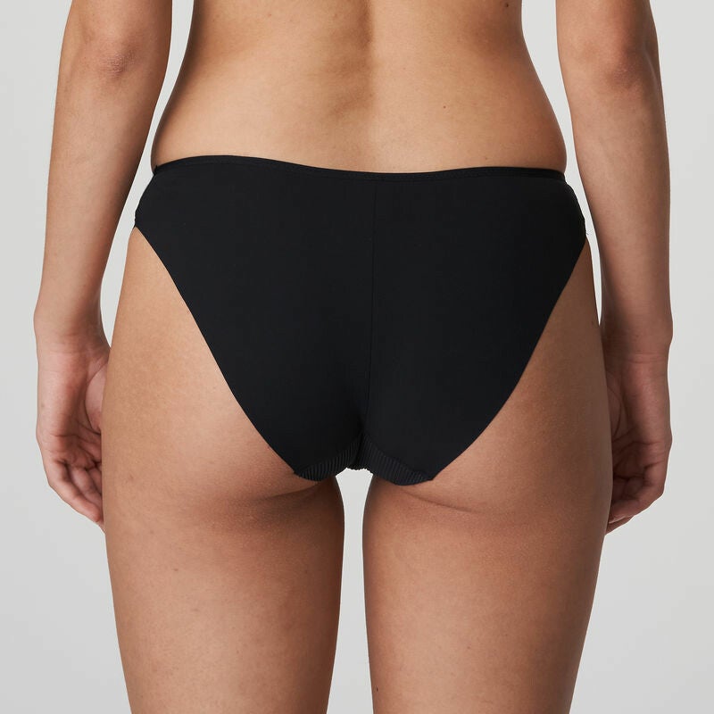 Elegant rioslip met streepjesstof vooraan, transparante kant op de heupen en een blikdichte stof op de bips.