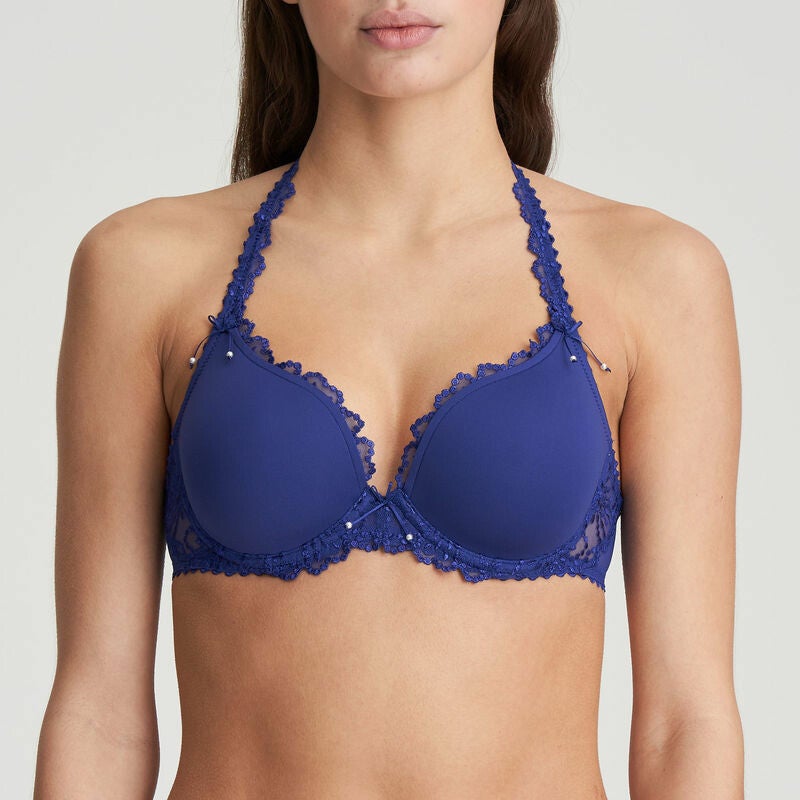 Het decolleté van de mousse bh lijkt wel op de punt van een hart. De cup gaat van diep uitgesneden in het midden naar hoog opzij en omvat de welving van de borst. Fijne broderie siert de bovenrand en zorgt dat de bh mooi aansluit.