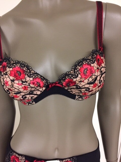 Zwarte bh met rode bloemenprint op een huidskleur ondergrond. Door de huidskleur ondergrond geeft dit de indruk dat de bloemenprint op de huid is geprint.