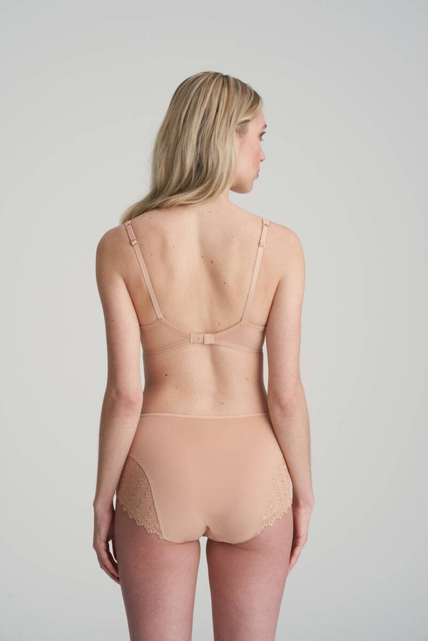 Romantische tailleslip met verfijnde broderie en guipure op de heupen en aan de billen. De kanten rand op de billen is uiterst fijn en tekent niet af. Light tan is een neutral: een frisse must-have tint in je lingerielade.