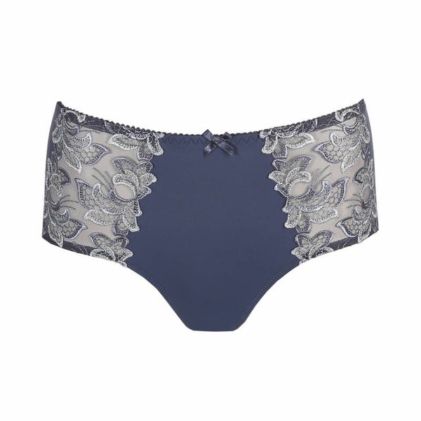 Een luxueus ondoorzichtig shortje afgewerkt met sierlijke broderie aan de beenuitsnijdingen. Nightshadow Blue is een trendy denimblauw met broderie in drie kleuren. Flatterend voor elk huidtype!