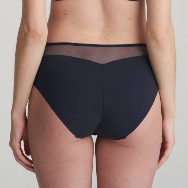 Elegante taillslip met broderie op de heupen en een transparant driehoekje in tule op de bips bovenaan. Night blue is een intense, donkerblauwe tint.