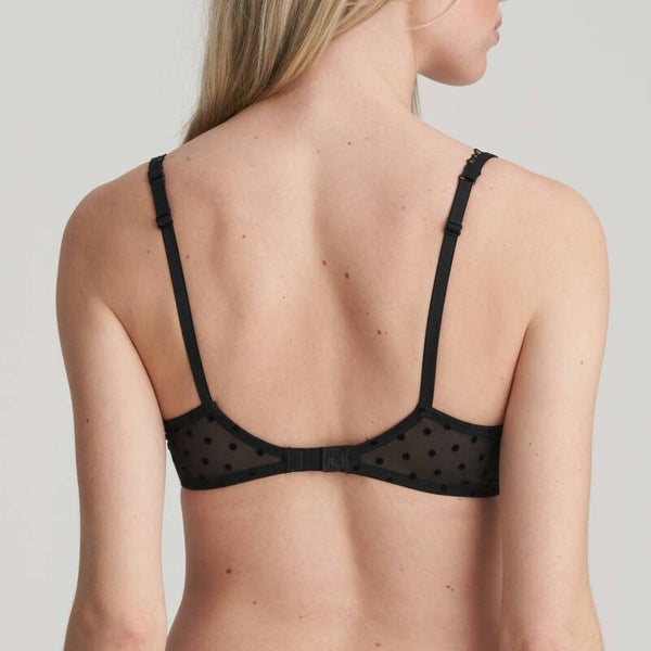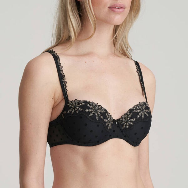 Fan van een koket, sensueel decolleté? Dan is de balconnet je op het lijf geschreven. Deze bh met mousse cups accentueert de welving van je boezem met glanzende bloemenbroderie. De nopjesprint op de cups geeft een retro touch aan de bh. Verfijnde details, zoals de broderie op de schouderbandjes en het strikje met een juweeltje tussen de cups maken het raffinement compleet.