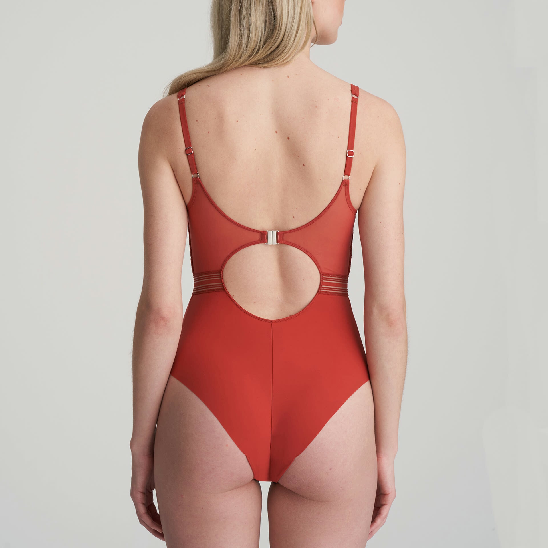De sensuele body is een echte eyecatcher: transparante kant siert de cups en een open rug steelt de show.