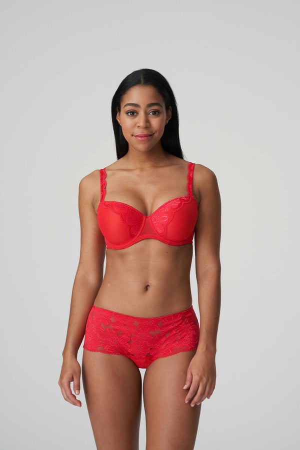 Vrouwelijke hotpants van mesh en hippe all-over-kant vooraan én op de rug.