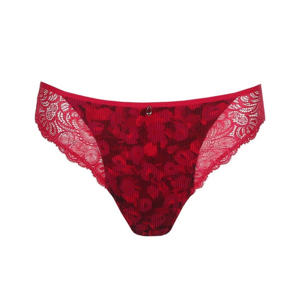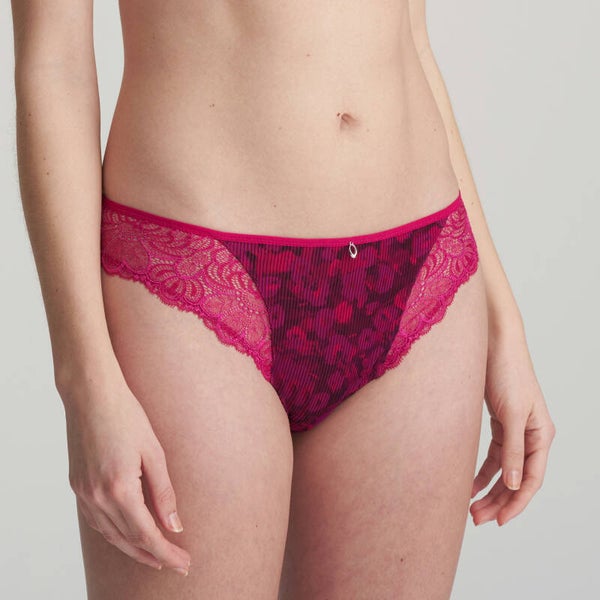 Elegant rioslipje met streepjesstof vooraan, transparante kant op de heupen en een blikdichte stof op de bips.