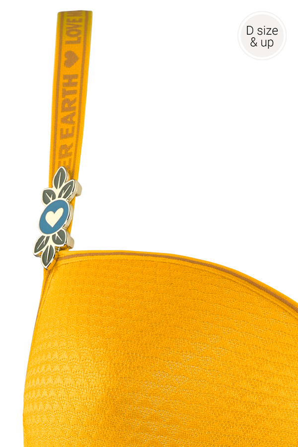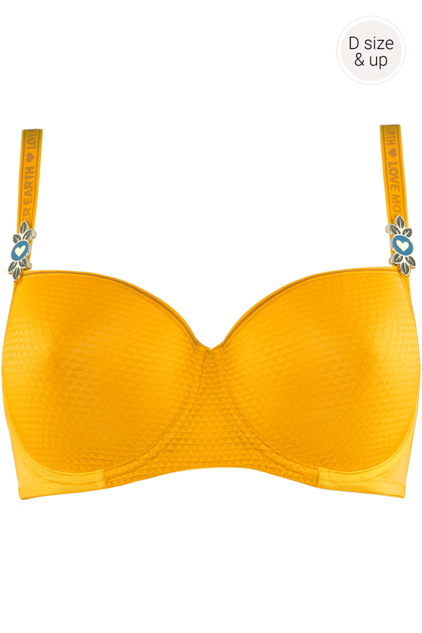 Deze oker gele bh heeft een klein figuurtje heel subtielverwegen in de stof, waardoor de cup glad blijft. Je kan deze beha dragen onder fijne kleding zonder dat de bh aftekent. Het bretel bandje heeft een fijne versiering.