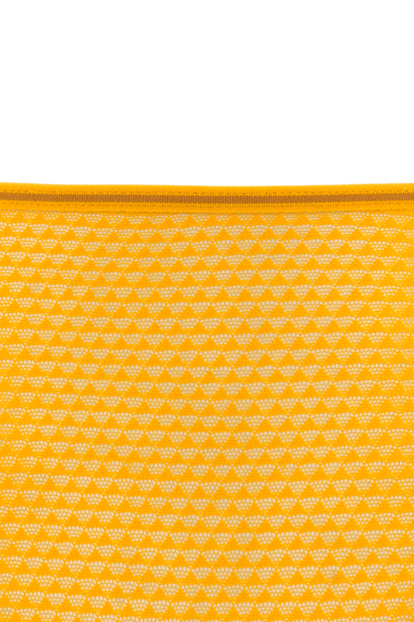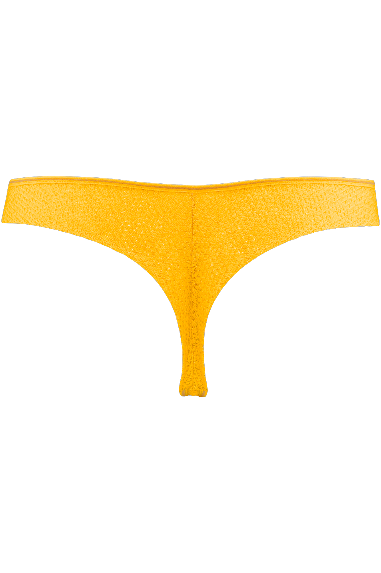 Deze oker gele string heeft een klein figuurtje heel subtielverwegen in de stof, waardoor de cup glad blijft. Je kan deze string dragen onder fijne kleding zonder dat de string aftekent.
