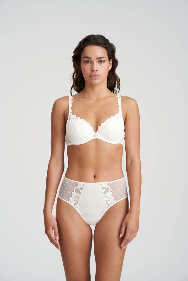 Hou je van het draagcomfort van mousse cups, maar wil je toch graag een gedecoreerde, rijke look? Deze mousse bh met ronde vorm verleidt met gesofisticeerde bloemenbroderie en retro nopjestule. De fijne schouderbandjes vormen de kers op de taart.