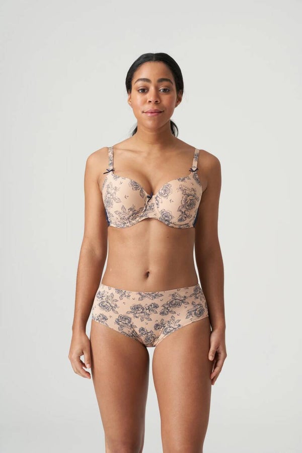 T-shirt bra met hartvormige mousse cups, overtrokken met een zachte stof met een tattooprint, en versierd met een kantje aan de zijpanden. De schouderbandjes zijn volledig overtrokken met de printstof.