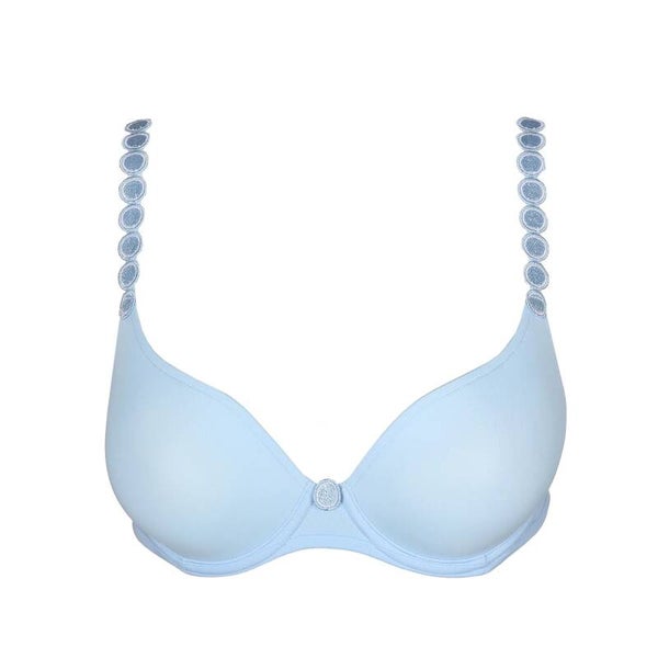 Mousse bh met hartvormige cup. De cup omvat bovenaan een groot deel van de borst. De hoge decolletébelijning boven de borst loopt diep omlaag tussen de borsten. De schouderbandjes kan je recht of om de hals dragen.
